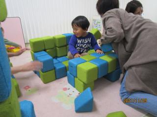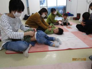 次に『ひっつきもっつき』という頭や手やおなかなど体のあちこちをくっつけて楽しむ遊びもとても盛り上がりました。