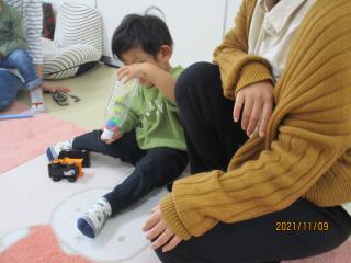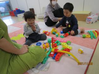 今日のサークル活動はあいにくの雨天の為、予定していた神社までのお散歩から『親子ふれあい遊び』に