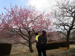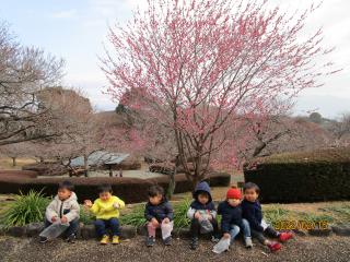 きれいな梅の木の前でお友だちと並んでお写真を撮ったよ