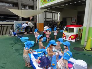 中庭にプールが設置されてから、「いつプール入るの?」とワクワクしていた子どもたち。