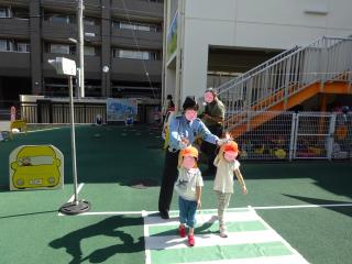 横断歩道を渡るときは「止まる・見る・待つ」の3つのお約束をし、いざ園庭へ!