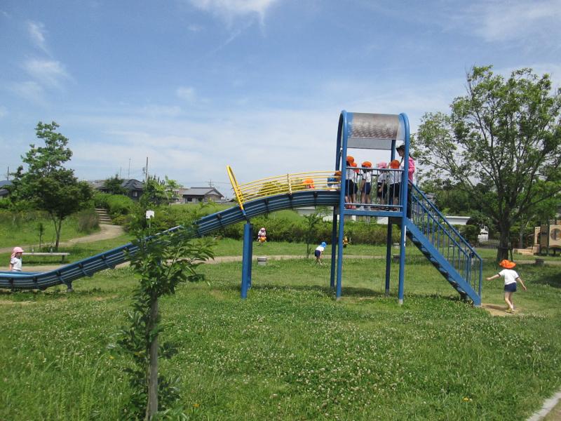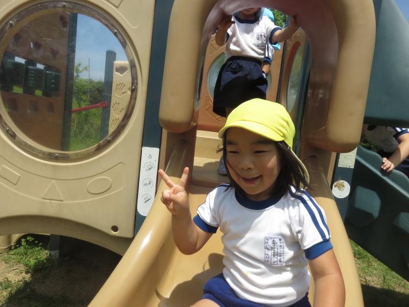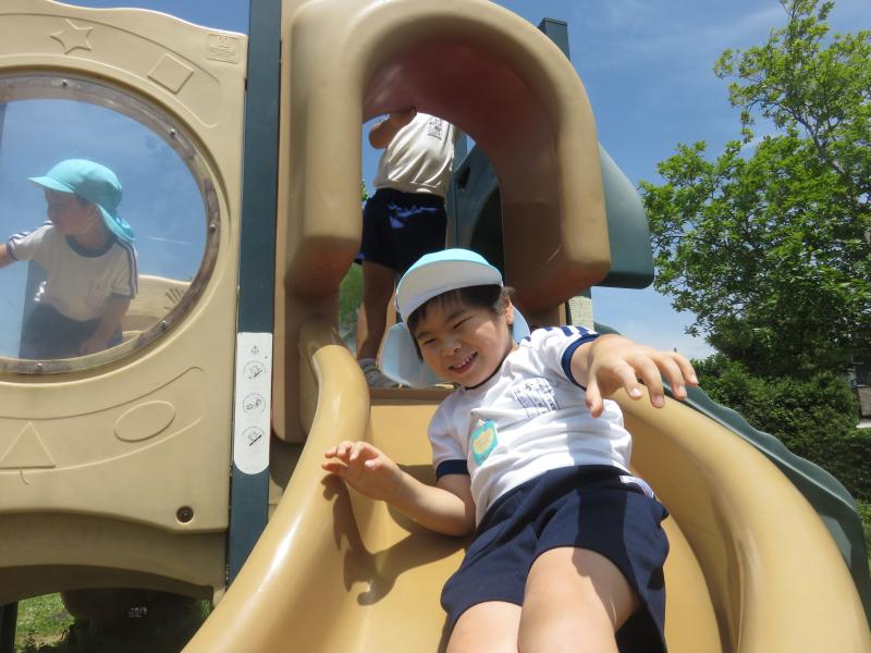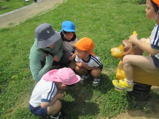 今日は絶好の公園遊び日和となり、子ども達と元気いっぱい体を動かして遊ぶことができました。今日行った公園は「二子塚公園」です。大きな滑り台があり、シロツメクサやタンポポがたくさん咲いている公園でした。大きいバスに乗れることが嬉しくて朝からワクワクしている子や、「ダンゴムシを捕まえるぞ!」と意気込んでいる子がいました。公園では広場を元気いっぱい走り回ったり、お家のお土産にするとお花を摘んだり色々な子ども達の姿がありました。来週から梅雨入りということで雨が降る前に園外保育に行くことができて良かったです。そして、今回の園外保育ではバスの中での過ごし方や公園での約束を事前に子ども達に伝えていました。約束をきちんと守り仲良く過ごせたことに子ども達の成長を感じ嬉しく思いました。