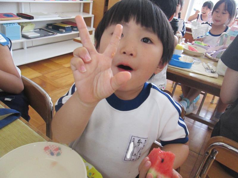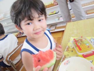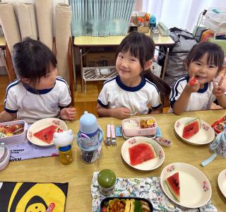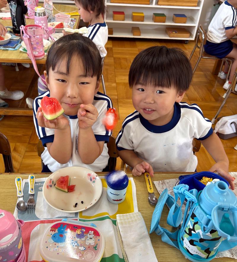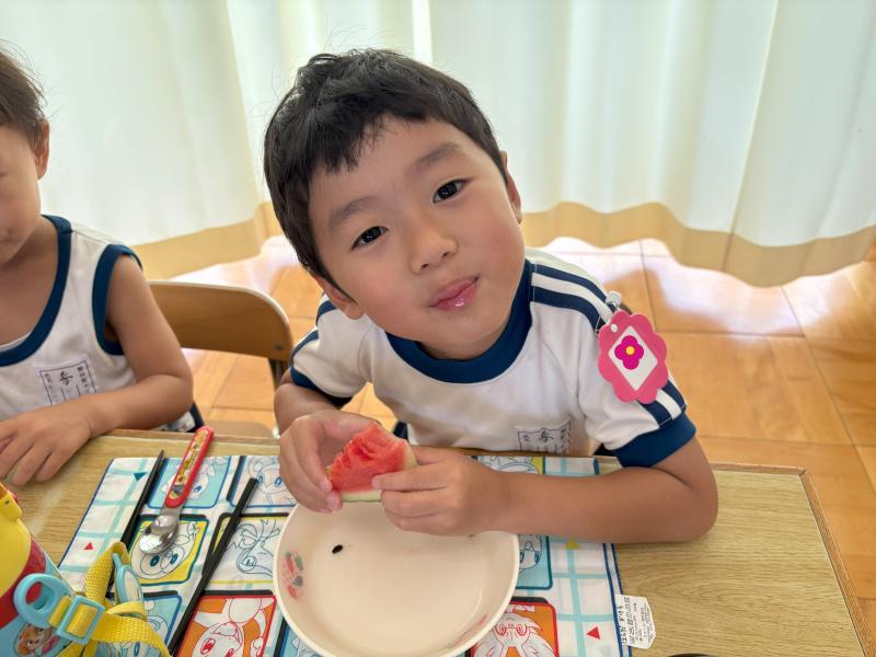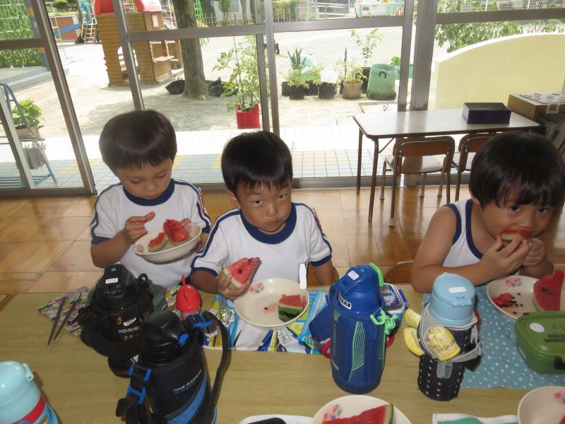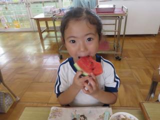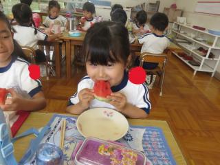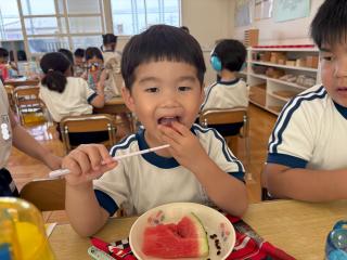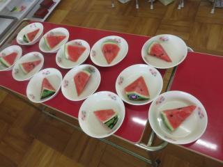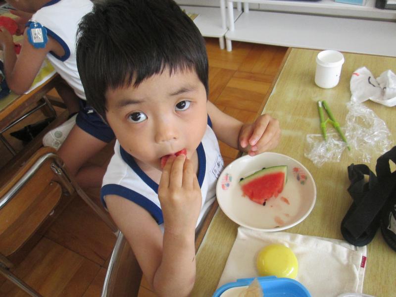 お弁当の時間にデザートとしてスイカを食べました。給食で食べているスイカより何倍も大きなスイカを食べることができ、子ども達は大喜びでした!「甘い、甘いスイカ♪」と言いながら食べている子がいたり、何度もおかわりをしている子もいたりしました。