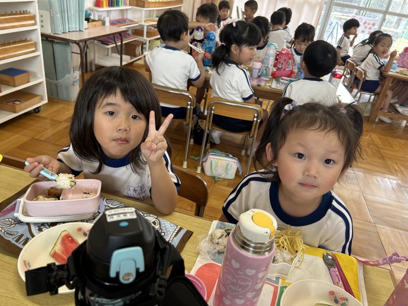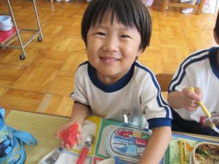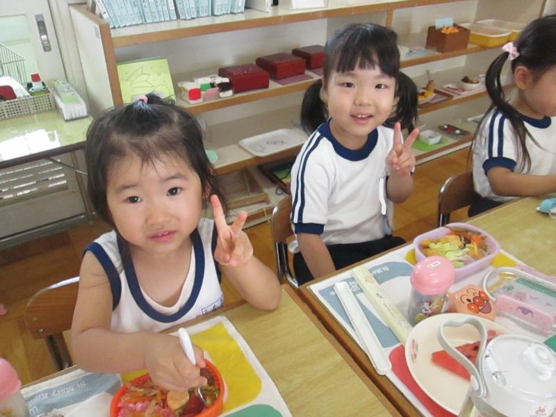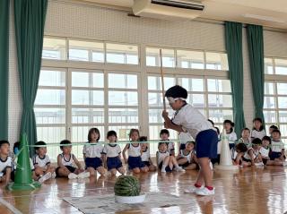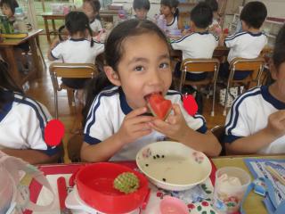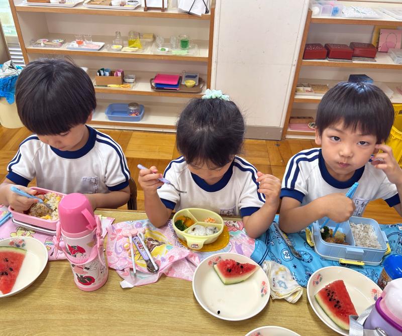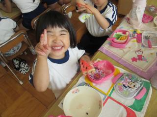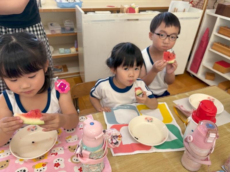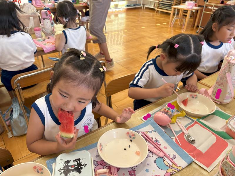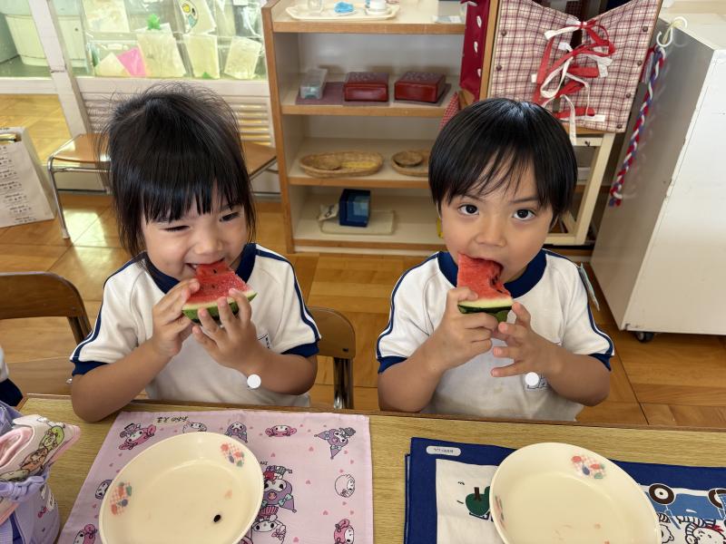 お弁当の時間にデザートとしてスイカを食べました。給食で食べているスイカより何倍も大きなスイカを食べることができ、子ども達は大喜びでした!「甘い、甘いスイカ♪」と言いながら食べている子がいたり、何度もおかわりをしている子もいたりしました。