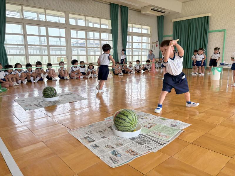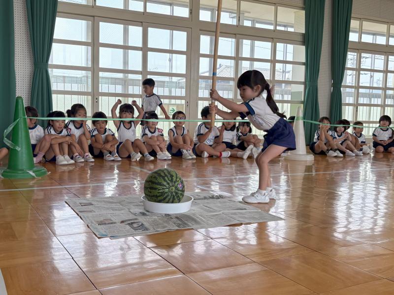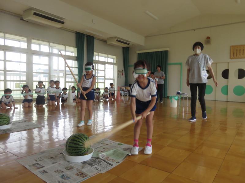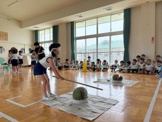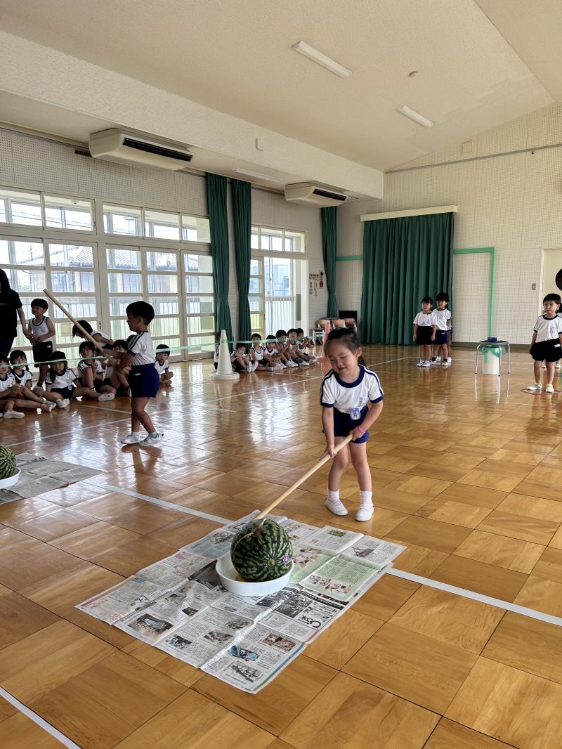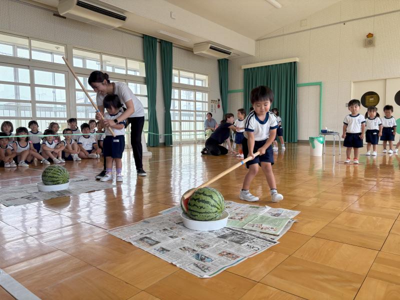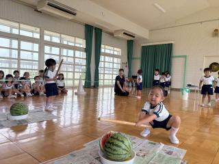 スイカ割りは遊戯室で2クラスずつ行いました。BCさんは目隠しをせずスイカを棒で叩きました。恐る恐る叩く子、思い切り叩くなど様々でした。
