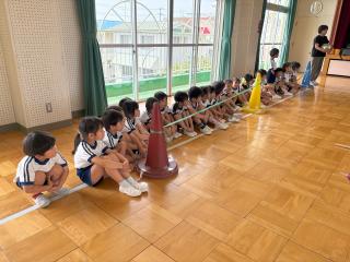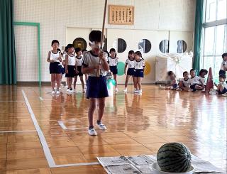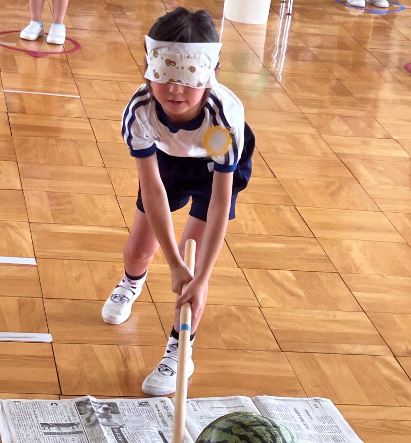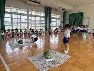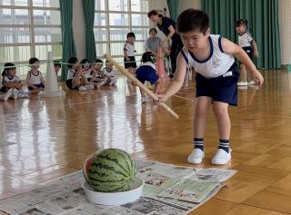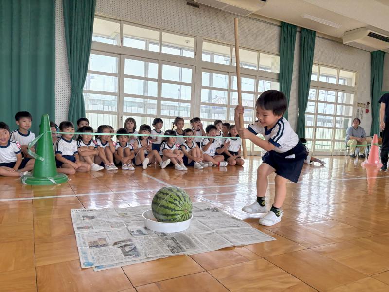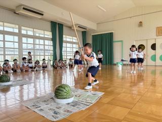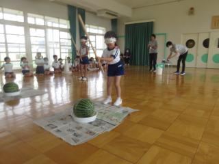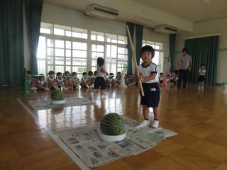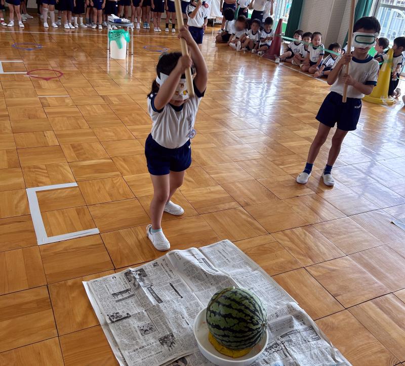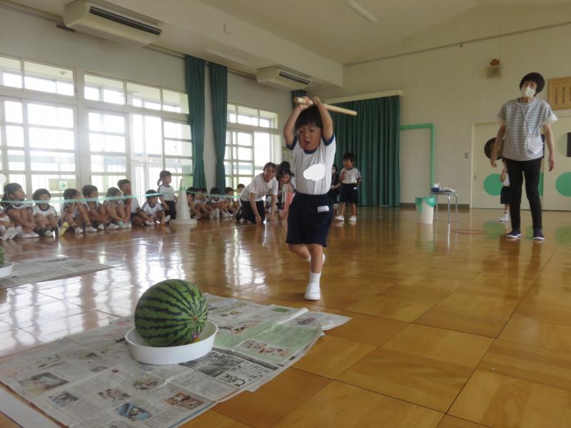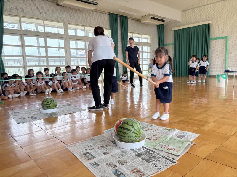 スイカ割りは遊戯室で2クラスずつ行いました。BCさんは目隠しをせずスイカを棒で叩きました。恐る恐る叩く子、思い切り叩くなど様々でした。