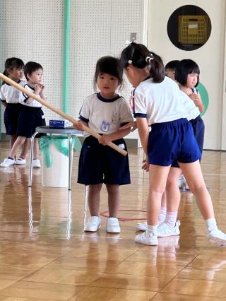 Aさんは目隠しをして挑戦しました。周りのお友だちも協力し、「もう少し前!右に行って!」と大きな声で応援しました。見事当てた時には大きな歓声が上がりました。