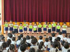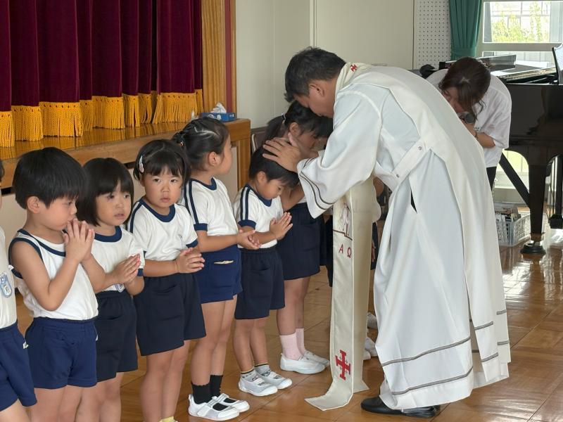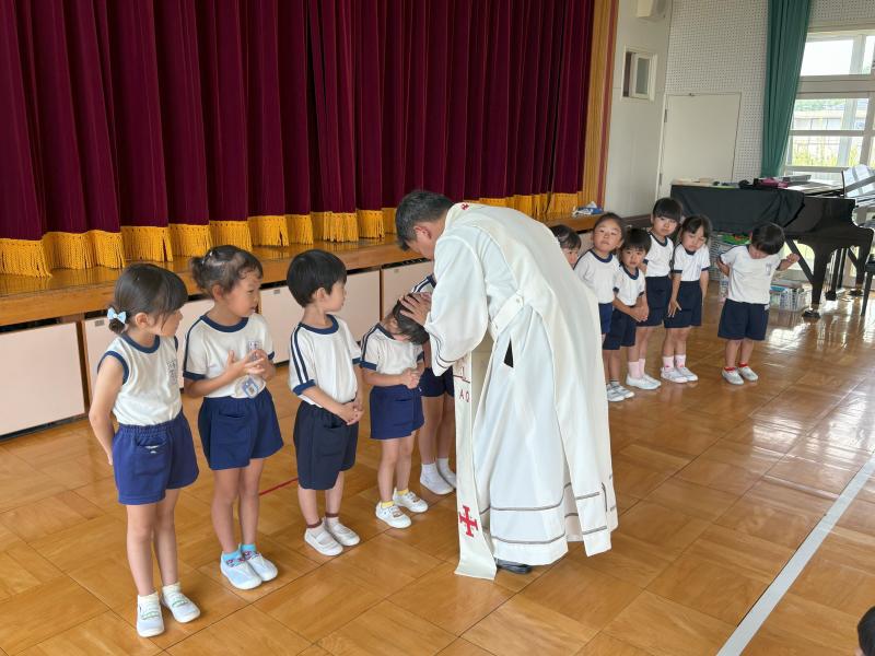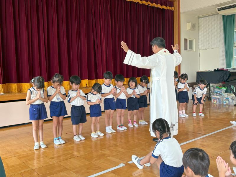 夏季保育4日目は、8月生まれのお誕生日会を行いました。どのお友だちもクラスや名前の発表も立派にできましたね!お誕生日の歌を歌ったり、ロエド神父様に祝福していただいたりして、みんなで8月生まれのお友だちのお祝いすることができました。