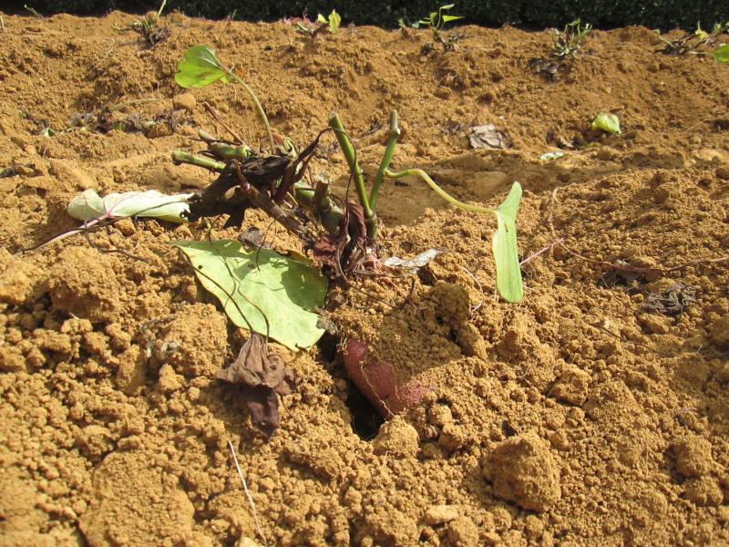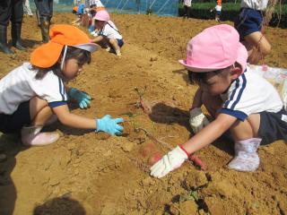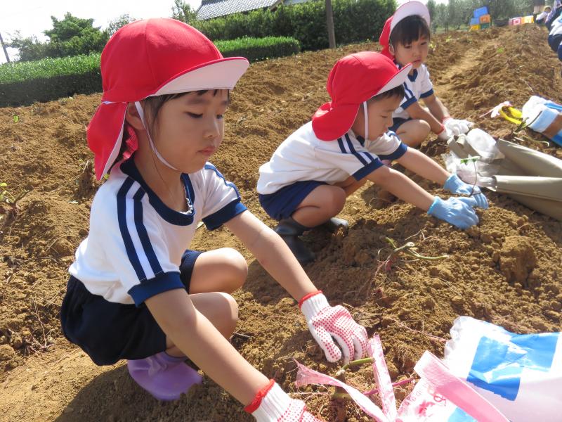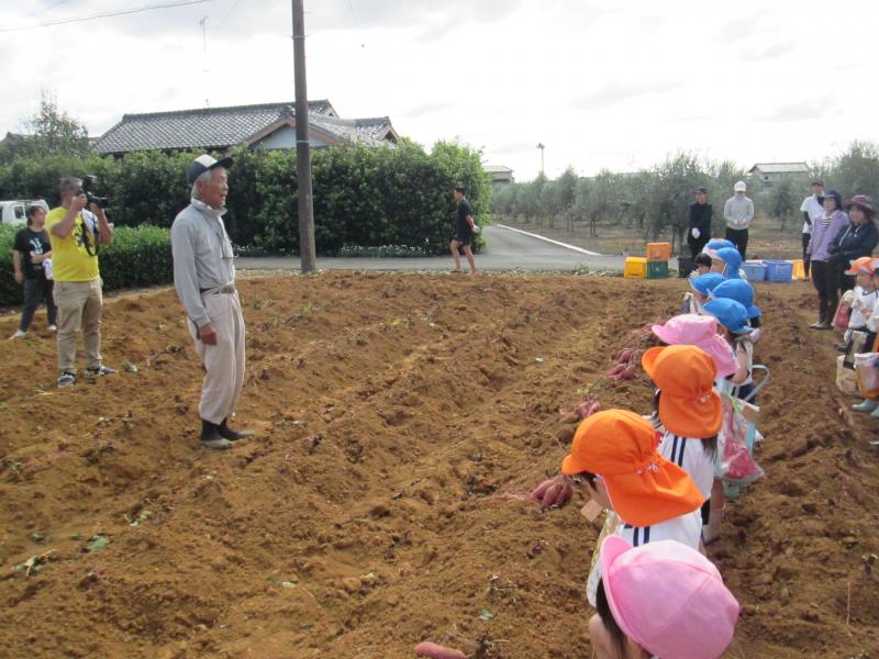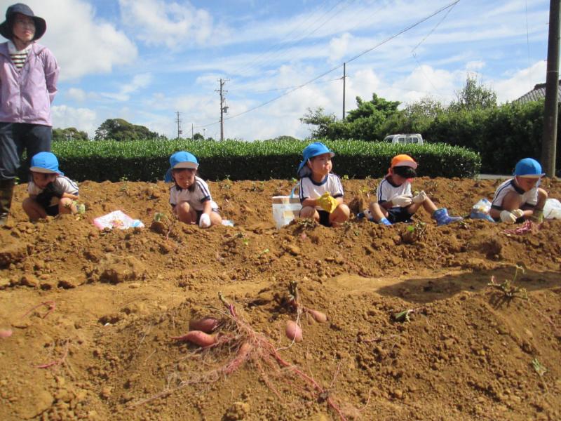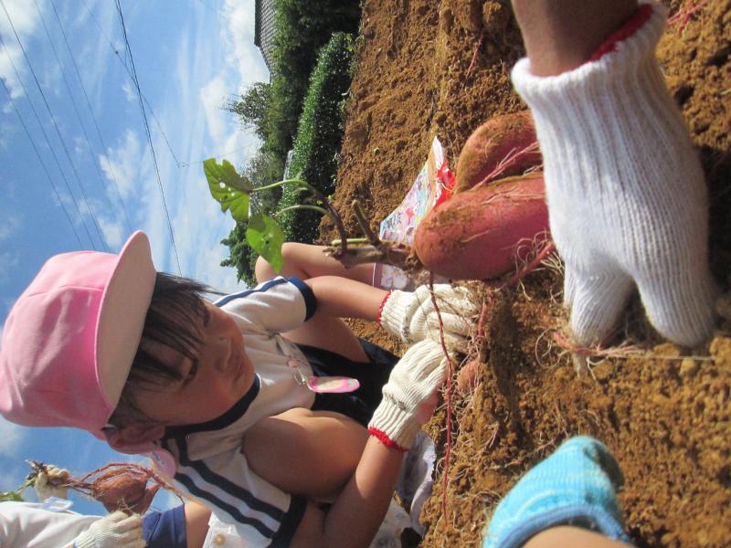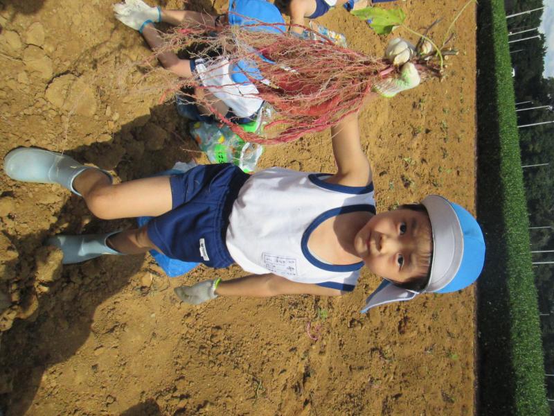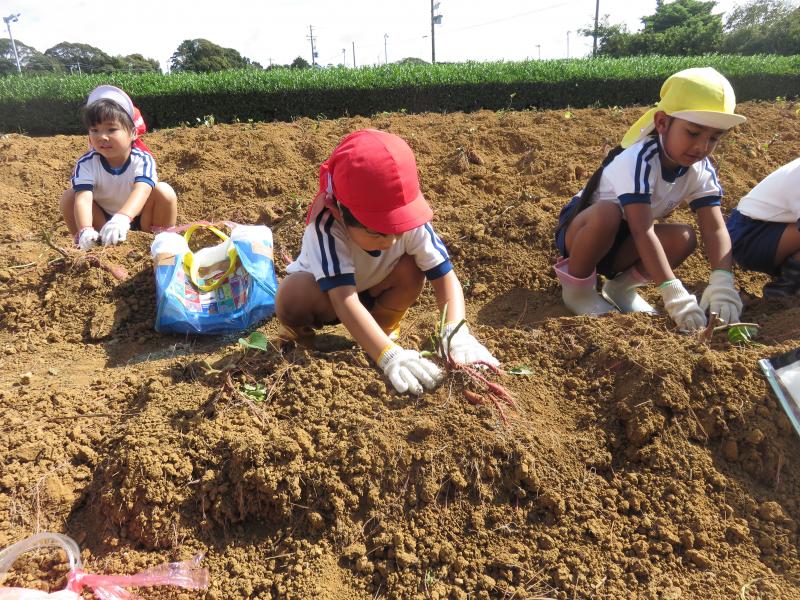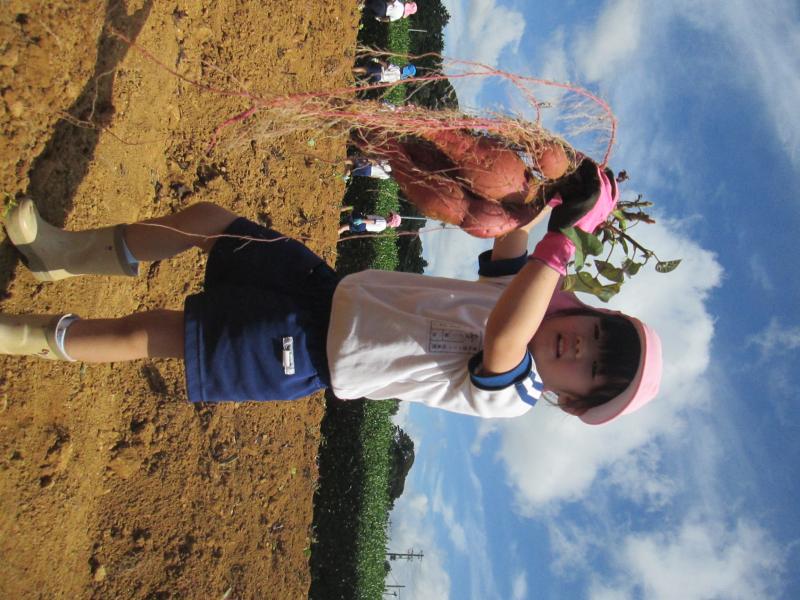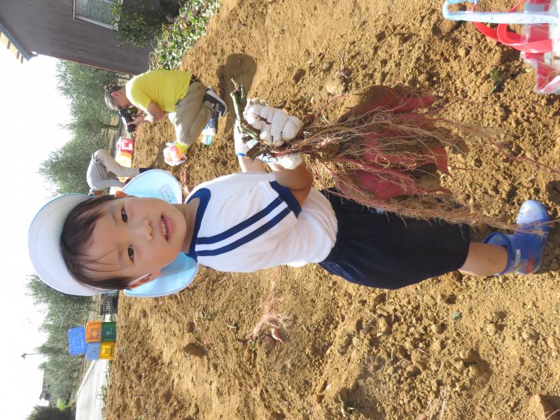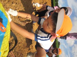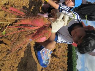 畑に着くと芋の掘り方を教えてもらい、「頑張って掘るぞー!!」「オー!!」の掛け声とともに早速芋ほりがスタートしました。大きい芋をたくさん堀ることができ、バックに入れるのが大変そうでしたが、嬉しくて、満足そうな顔が印象的でした。Cさんへのお土産用の芋もたくさん掘るお手伝いができました。慣れない芋畑に足をとられながらたくましく芋を掘る姿に成長を感じ、また一つ思い出を増やすことができました。お芋は、10日間ほどおくと甘くなるそうです。畑のお世話をしてくださった方々に感謝をしながらいただきましょう。