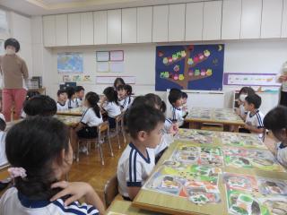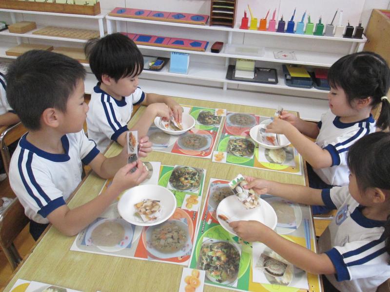 今日の活動は、食べ物の写真を使って料理の名前と料理のバランスを覚える活動でした。