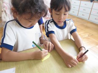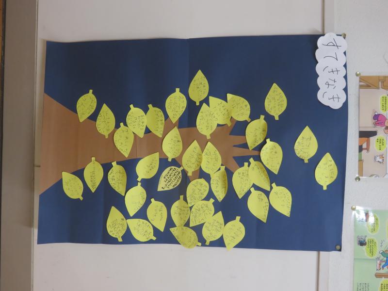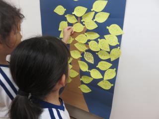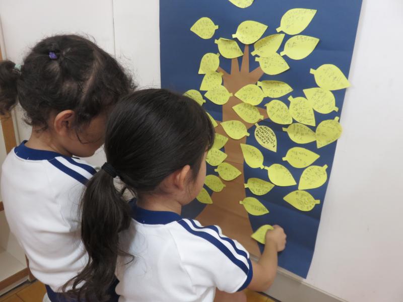 葉っぱに書いたすてきなことを読み合い、友達の良いところに気づき、褒め合う姿も見られました!