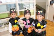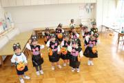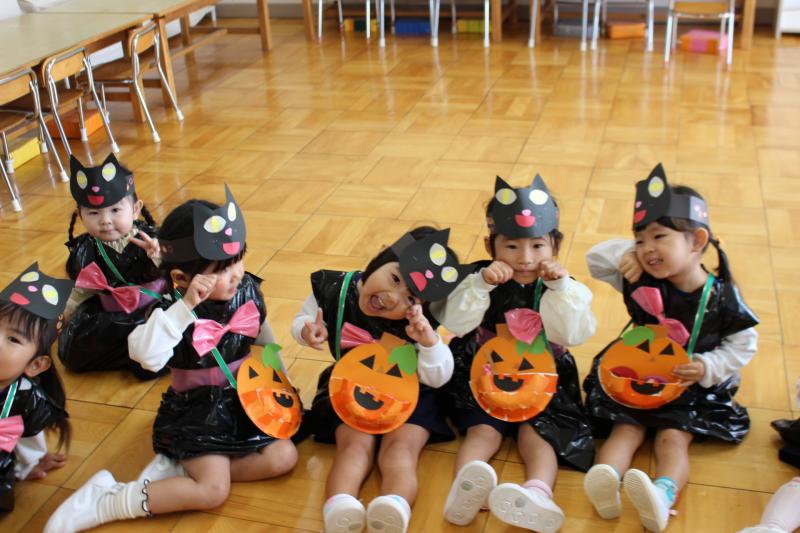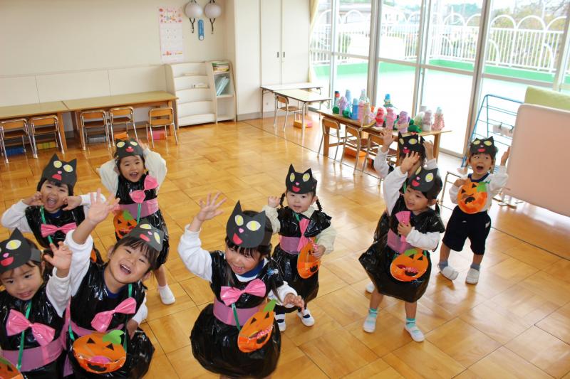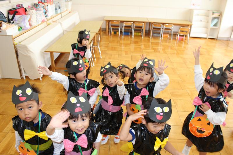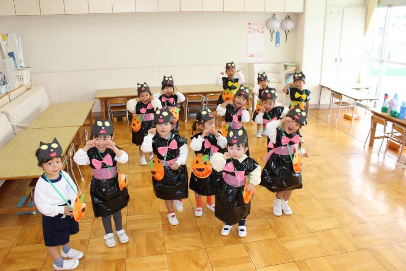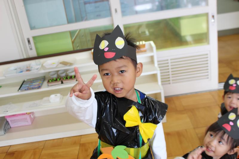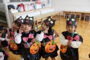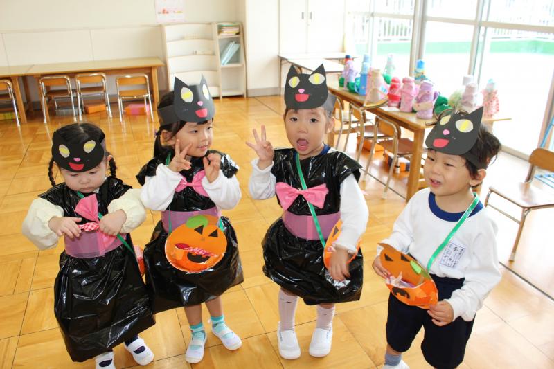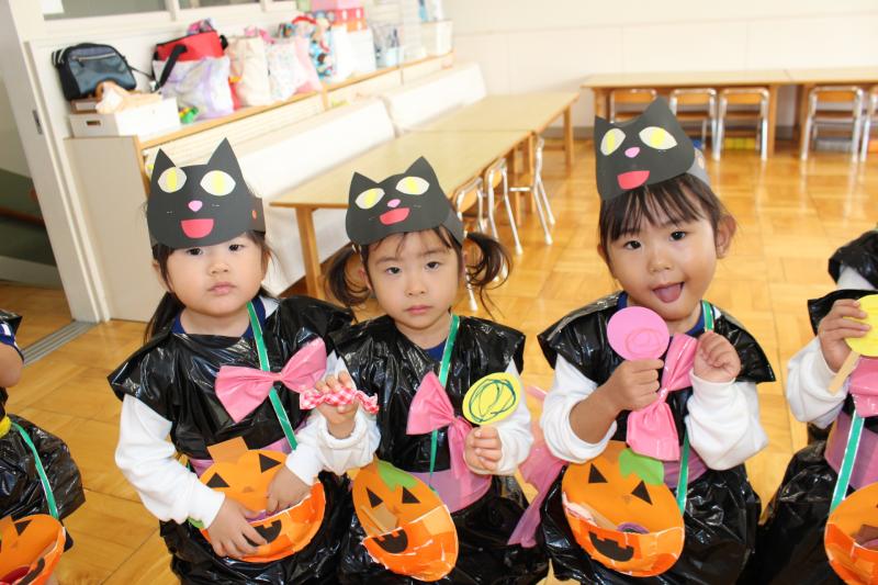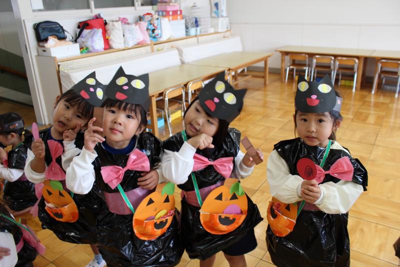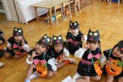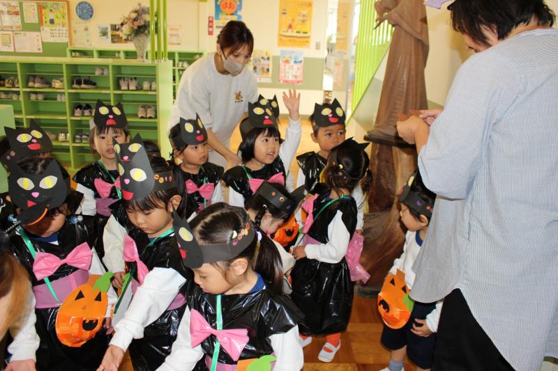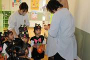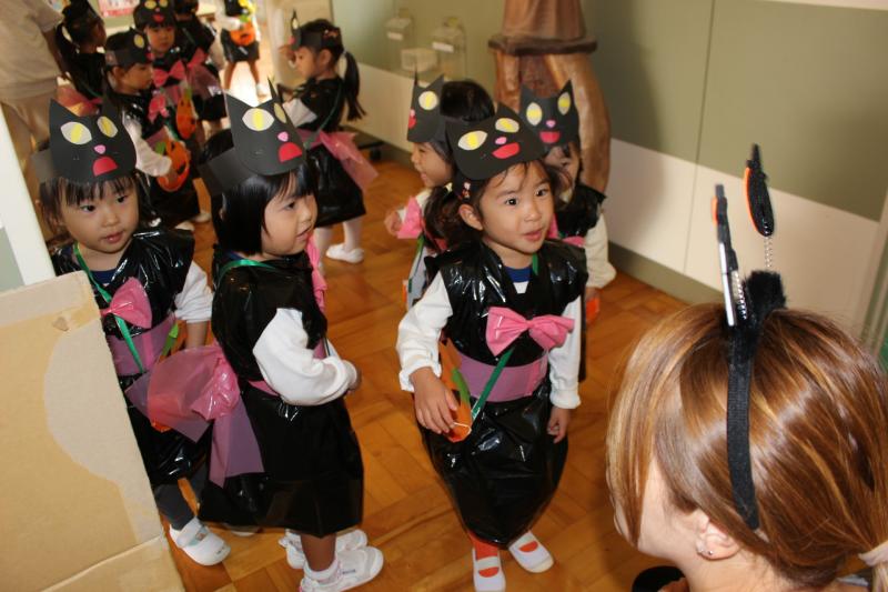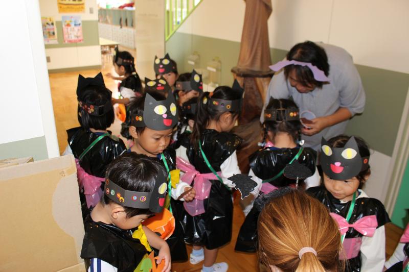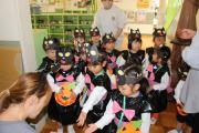 先生たちが衣装を着せると、さっそく「ニャーニャー!」とネコちゃんになりきっている子どもたち。自分で作ったかぼちゃのバッグを下げ、職員室や保育室の先生たちを訪問しました。みんなでそろって「お菓子くれないといたずらしちゃうニャ♪」と言うと、先生たちがキャンディーやビスケットをバッグに入れてくれました!AさんBさんにも「かわいい~!」とたくさん言ってもらい、子どもたちもにっこにこ。楽しいハロウィンパーティになりました。今日つけたお面や衣装などは持ち帰りますので、よかったらお家でも楽しんでみてください♪