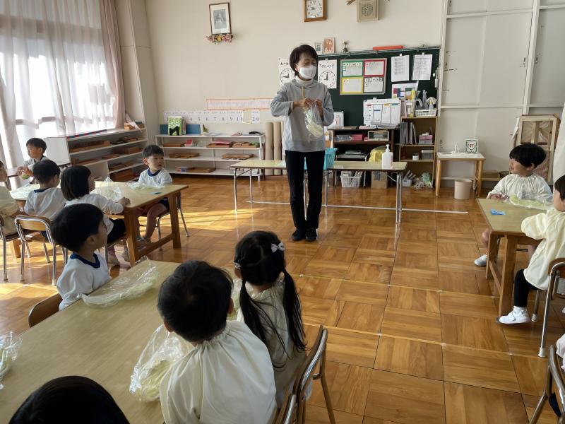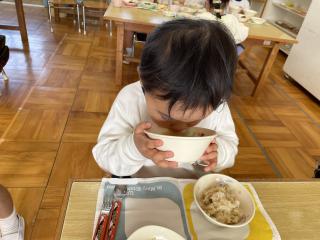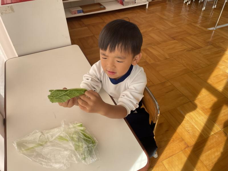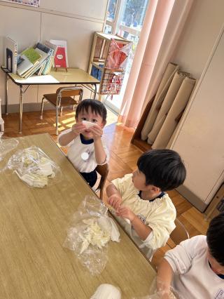 野菜をちぎる作業はご家庭でもしやすいお手伝いだと思います。指先を使うことで、スプーン、鉛筆、箸を正しく持つことに繋がります。ぜひ、ご家庭でも挑戦してみてください!