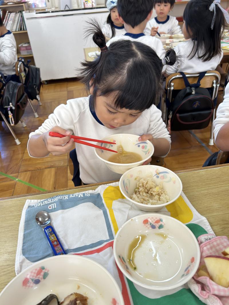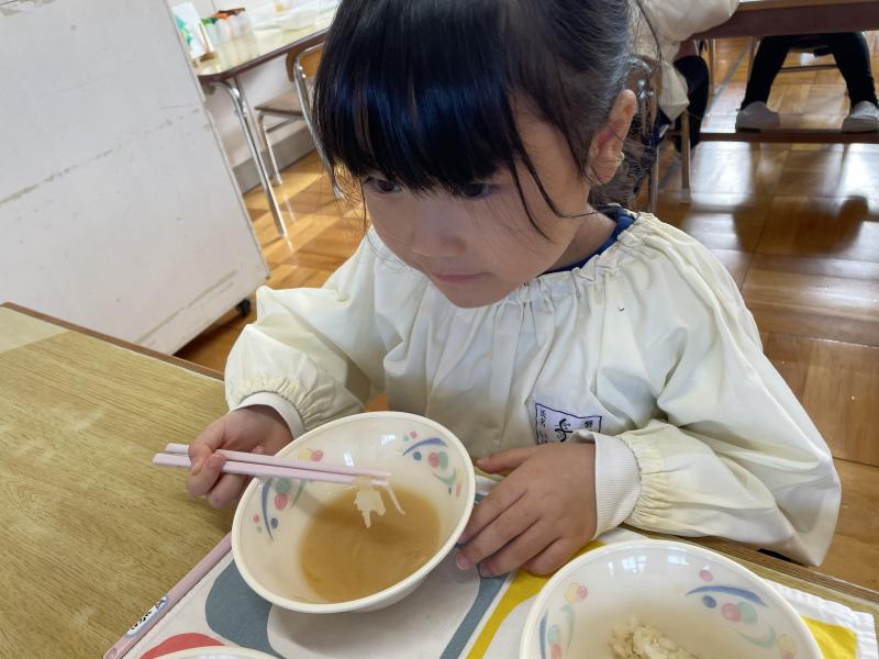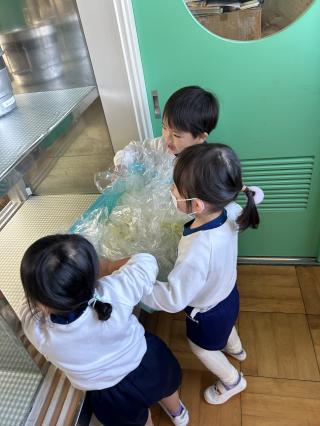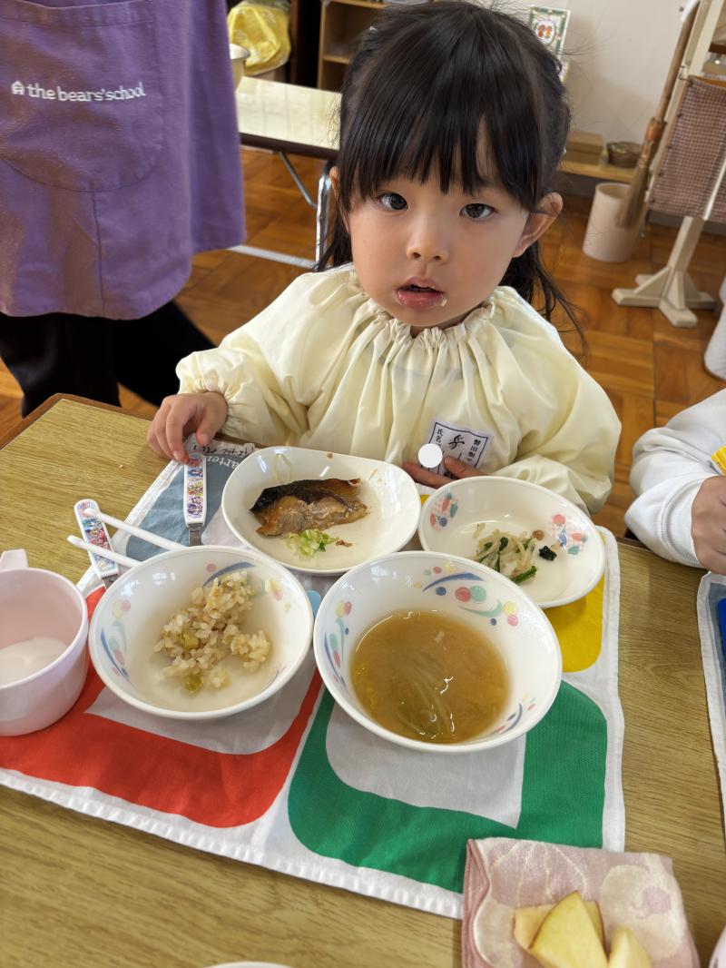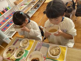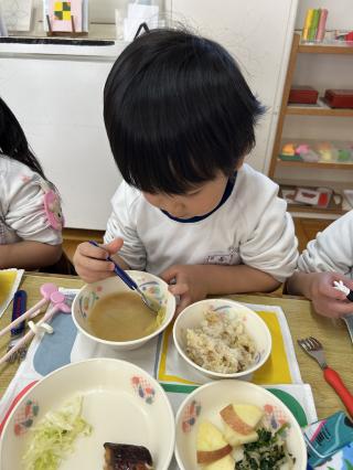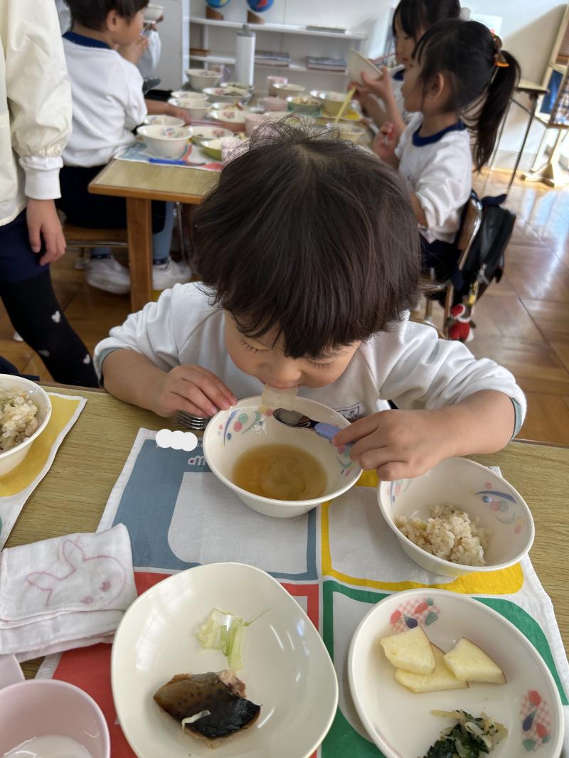 そして、給食の時間になると、「今日はCさん、Dさんがお手伝いをしたんだよ」とAさん、Bさんに報告する姿がありました。野菜が苦手な子も、C、Dさんがお手伝いした白菜の味噌汁を完食する姿がありました。お手伝いした料理はいつも以上においしく感じますね!