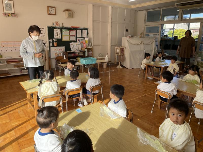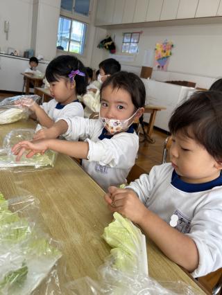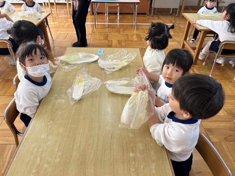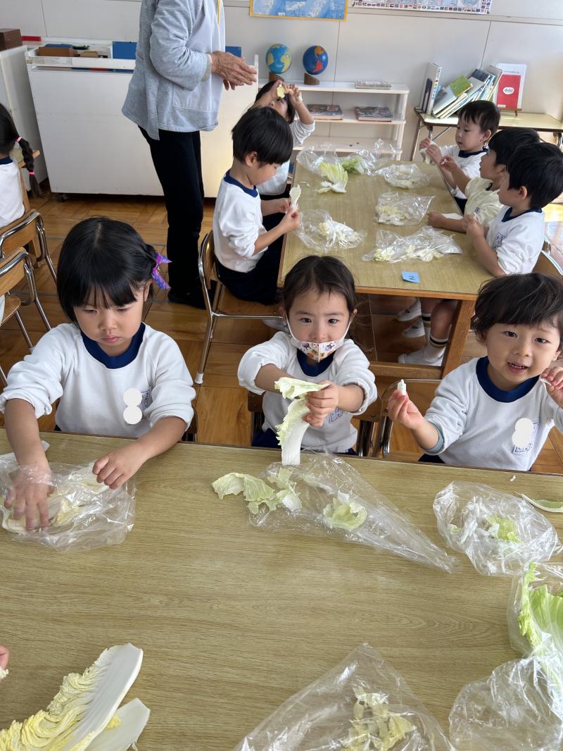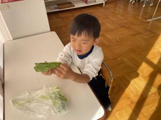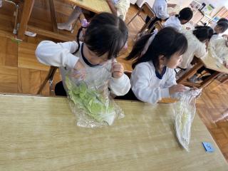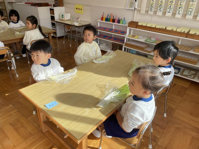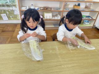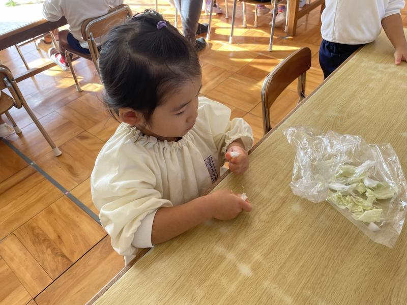 Cさん、Dさん食育がありました。今日の活動は「白菜をちぎる」でした。まず、においを感じること、触ってみること、形を見ることをしました。使う野菜がどんなものか知ることは大切なことですね!「どんな匂いがする?」と聞くと、「お日様のにおいがする!」と教えてくれました。また、形を見てみると「こんな形!」と身体を使って表現する姿が見られました。Cさん、Dさんらしい表現の仕方がとても可愛らしかったです。白菜を五感で感じた後は、ちぎる作業に進みました。「Aさんの口の大きさはこのくらいかな?」と口の大きさに合わせて白菜をちぎる姿がありました。思いやりの心が育っています。かたい芯の部分も強い手、指先を使ってちぎることができました。芯の部分をちぎると「ポキッ」と音がすると「ほんとだ!」と耳をすませながらちぎる作業を楽しんでいました。