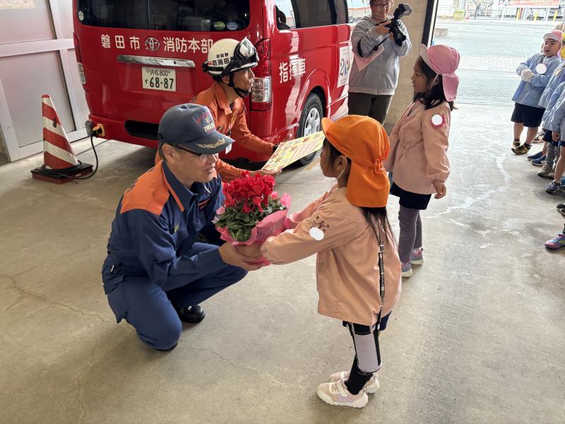 隊員さんに感謝のお花とプレゼントをお渡しした後は、施設内の設備や、消防車両の説明をして頂きました。様々な機能がある消防車のお話しに、興味津々のAさん達でした。