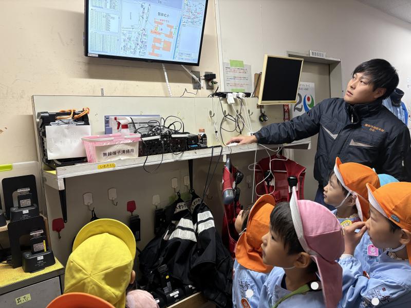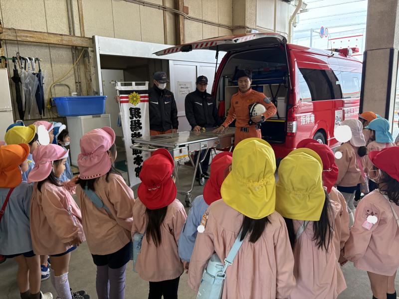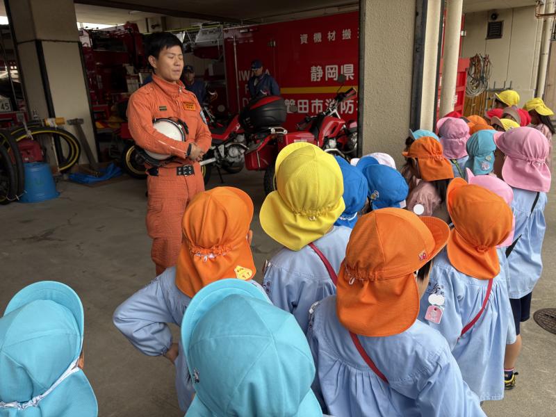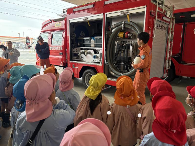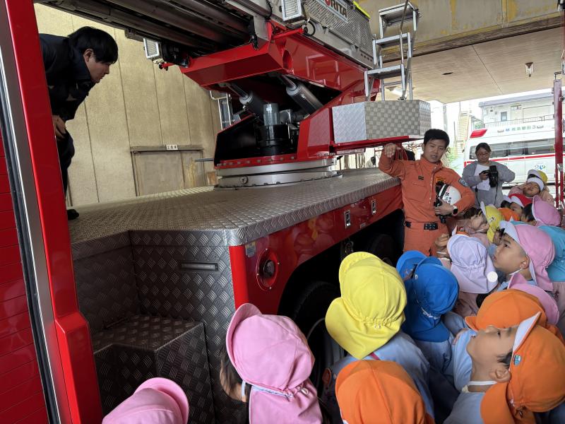 最後には質問の時間も設けていただき「火事の時は何台出動するの?」「これはどんな時に使うの?」と子ども達の疑問に優しく丁寧に答えてくださいました。