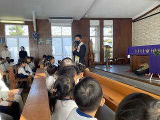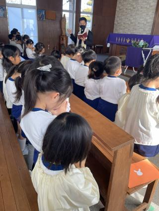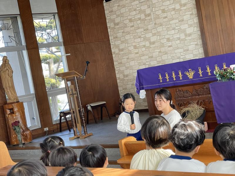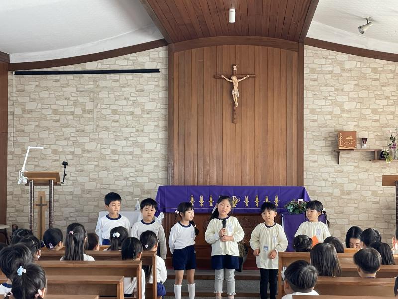 そして、今日で幼稚園を退園する友達の紹介をしました。寂しくなりますが、離れていてもマリア幼稚園のお友達です。また、遊びに来てくださいね。幼稚園からお祈りしています。