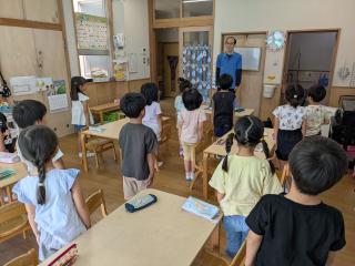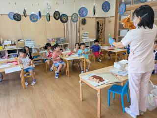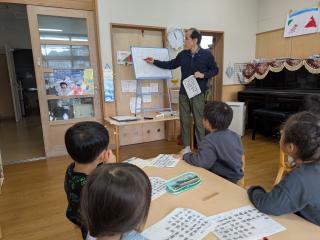 年長児対象の字の教室の1回目が行われました。楽しみにしていた園児も多く、しーちゃん先生と楽しい1時間を過ごしました。