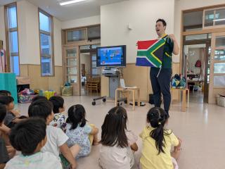 南アフリカ出身のヒュー先生が来て下さり、南アフリカの有名なスポーツや食べ物、動物などを教えてくれました。様々な文化に触れる貴重な機会となり、南アフリカ国旗を作る子もいましたよ!