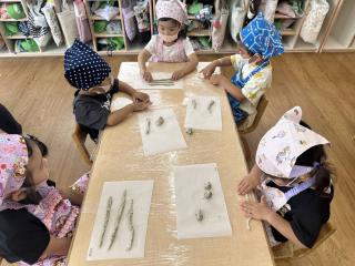 年長児が陶芸体験を行いました。始めは丸かった粘土を両手で形を整え、模様をつけて完成!焼き上がりが楽しみです。今回作った抹茶碗を使って、お茶会を行う予定です!
