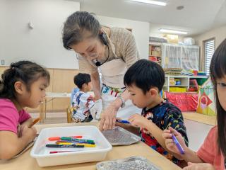 しーちゃん先生に来て頂き、字の教室が行われました。塗り絵や間違い探し、時には先生のマジックも見ながら、子ども達が取り組めるよう工夫をして下さり、あっという間の1時間です。