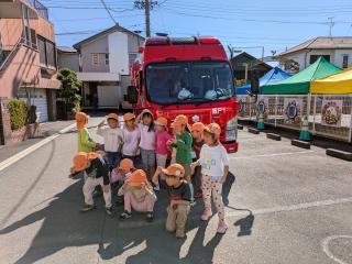 今回の訓練では、消防士の方に実際に避難の様子を見て頂きました。避難の際の注意点などを教えて頂き、職員は水消火器訓練や通報訓練などを行いました。駐車場に止まった消防車は大きくてかっこよかったです!