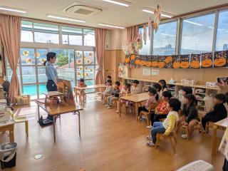 本日は交通指導員の方が来てくれて、各クラスで道路の渡り方などの話をしてくれました。その後、年少、年中は園庭で横断歩道の渡り方を確認し、年長児は実際に道路へ出て、2人組で歩く練習をしました。