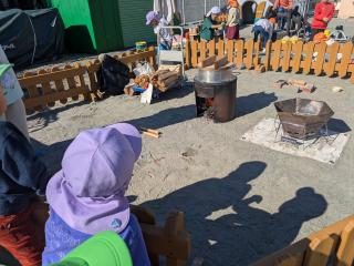 炊き出し訓練を行いました。災害時にガス等が使えなくなった事を想定し、薪に火を付け、釜で実際にご飯を炊きます。火が付くと「おぉ~」と声をあげたり、火傷しないようにとバケツに水を入れて持って来てくれる子もいました。炊けたご飯は園庭でみんなで食べ、感想は…「美味しかった!」