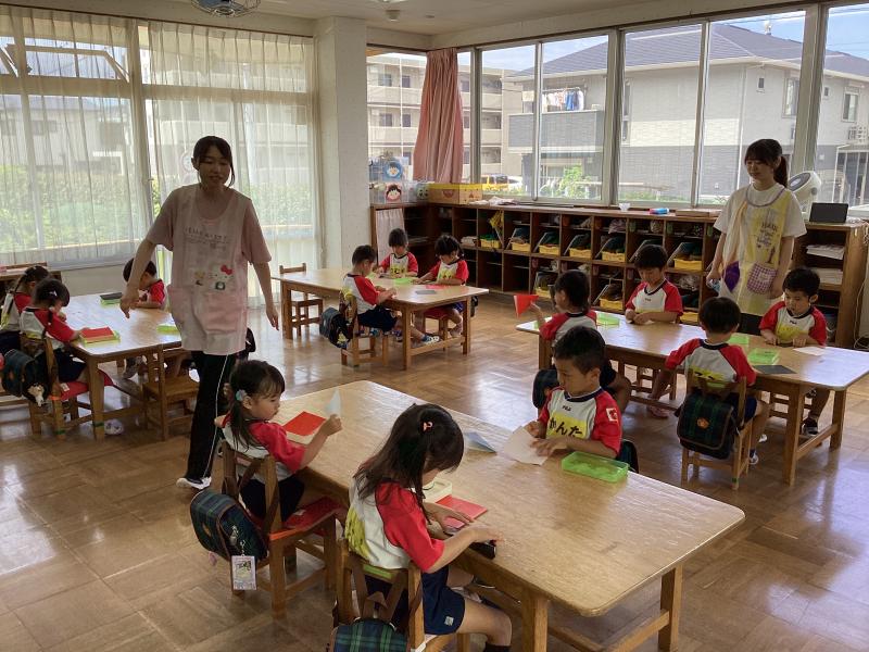 角と角を合わせて折り進めていくと…川や海で泳ぐ生き物になります♪