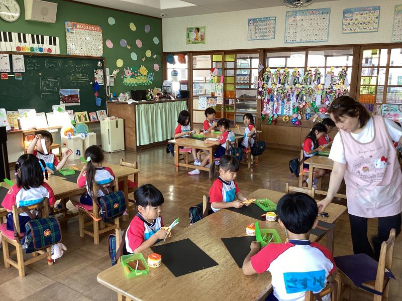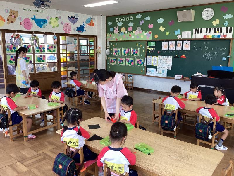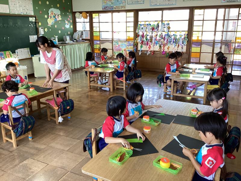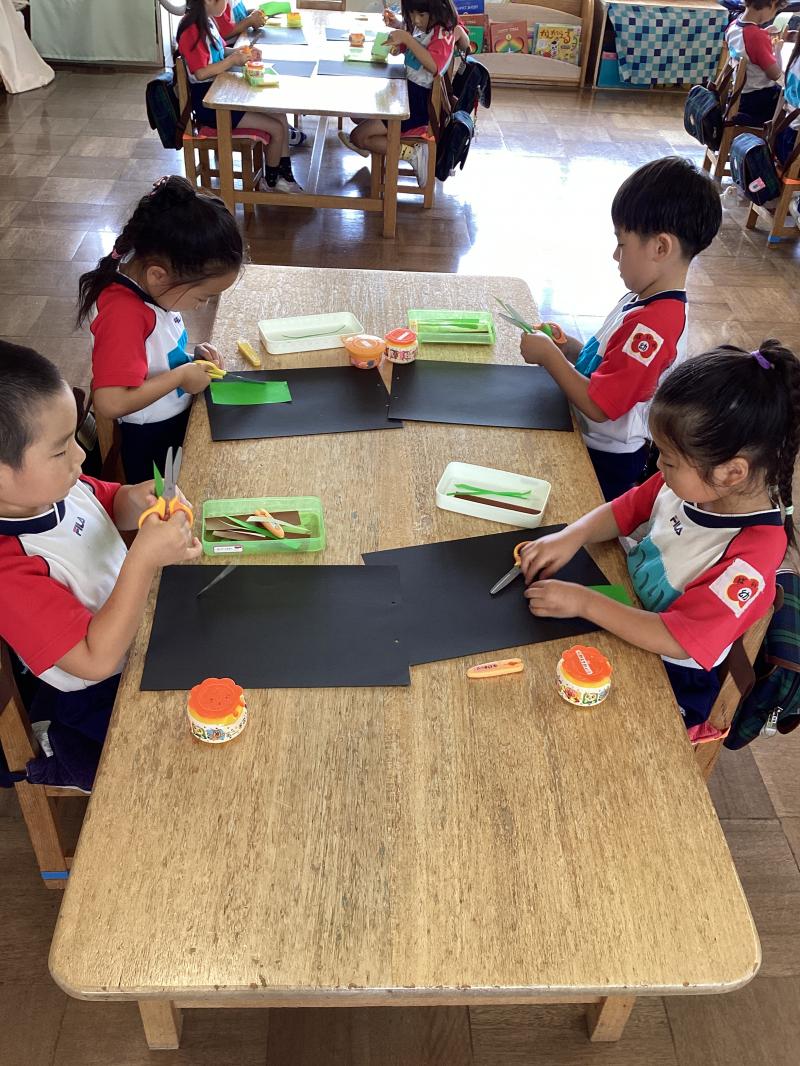 くま組さん☆はさみで黄緑色の折り紙を切っています!