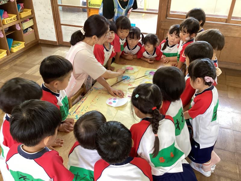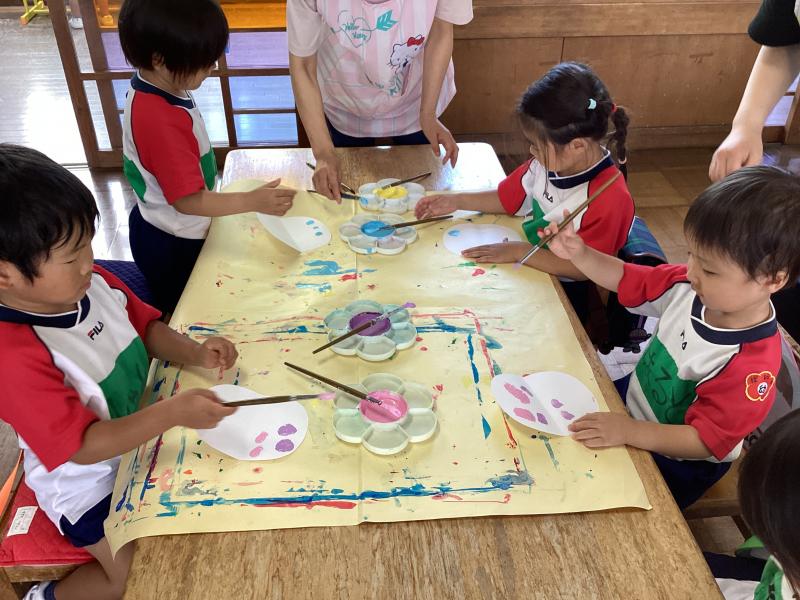 カラフルな絵の具を筆につけて自分で円につけていきます!絵の具楽しい~