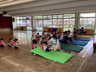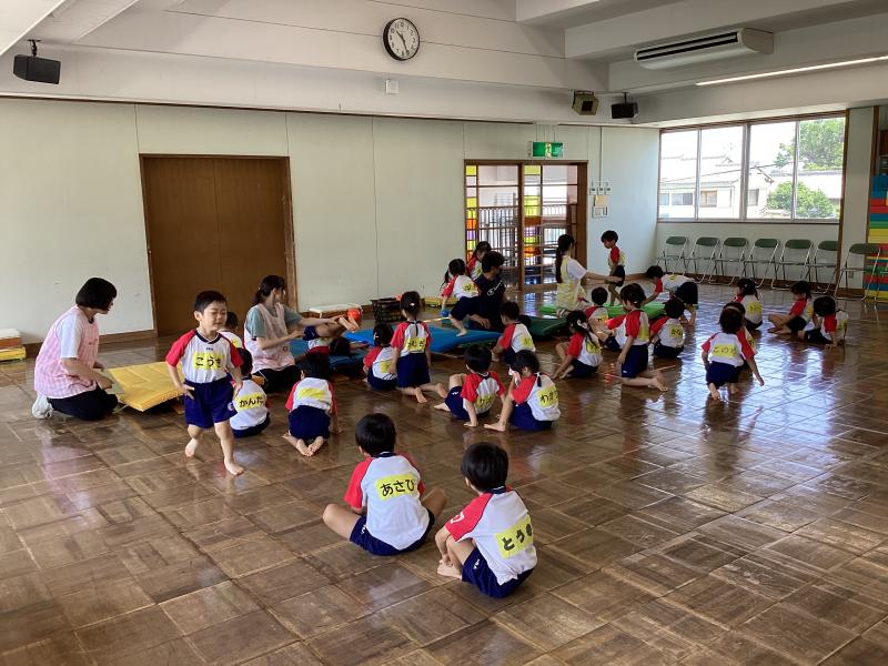 先生たちに補助してもらい、マットの上で前転の練習です☆