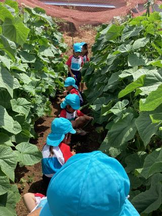 • キュウリの収穫です!大きいのを探して手でくるくる回して沢山収穫しました♪