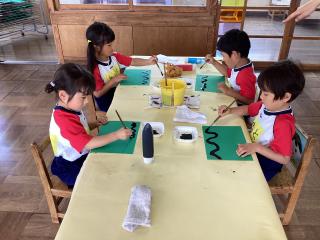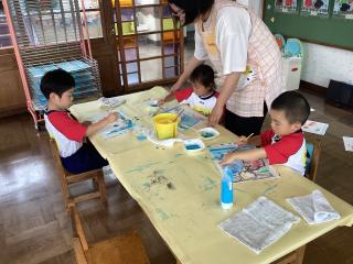 クレヨンで描いた魚や海藻の上から、青い絵の具を塗ってはじき絵をしました♪丁寧に白い所がなくなる様に塗りました!! -