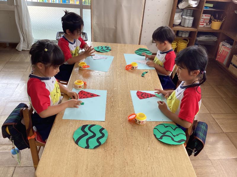 一人一人違った模様の画用紙をスイカの形に切って貼れました!とっても美味しそうです(*^-^*) -