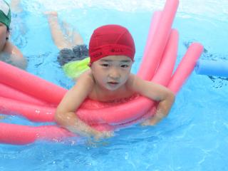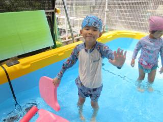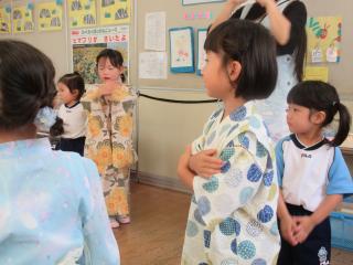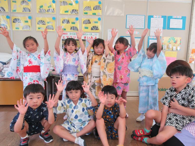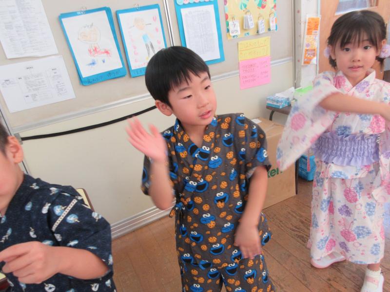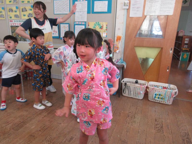 今年の盆踊りは気温の関係で室内で行いました。さくらさんに「こうだよー」と教えてあげながら、上手に踊っていたうめさんです!