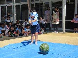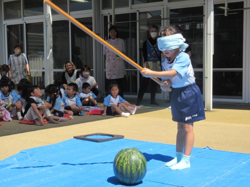 スイカ割り!なかなか難しかったけど、ぱっかーんと割れたときはみんなで大盛り上がりでした!