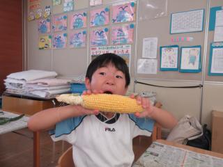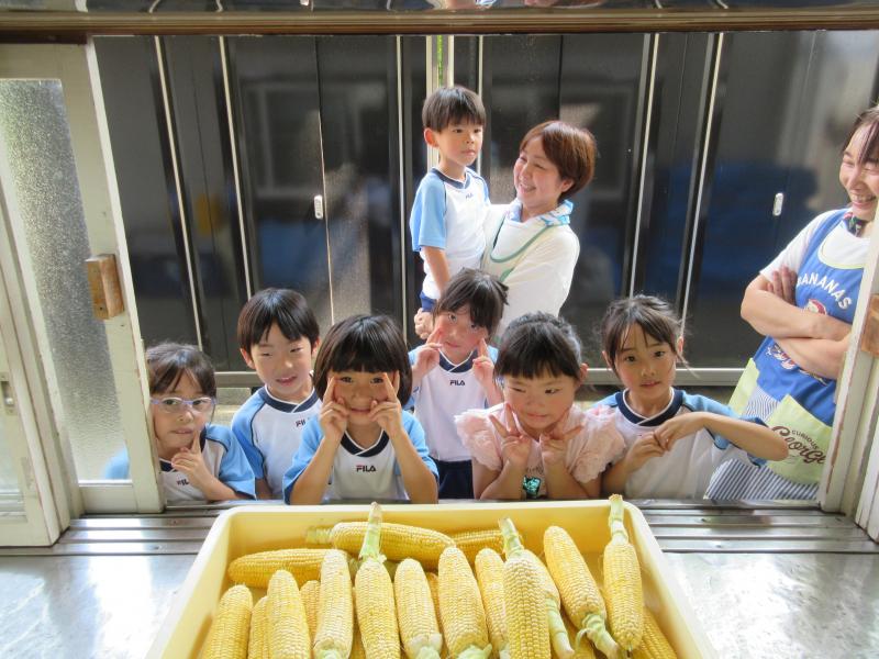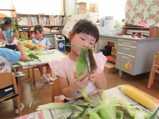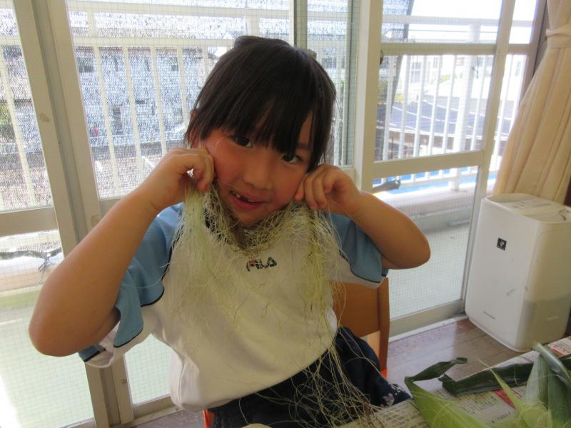 夏の野菜トウモロコシの皮むきもやりました!黙々とたくさんのトウモロコシの皮むきをしてくれました。「みて~ひげだよ~!」と楽しむ姿もありました(*^^*)