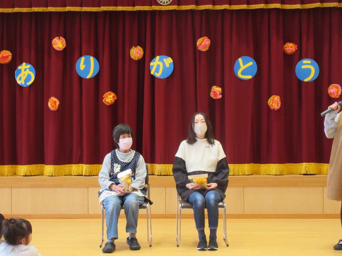 3月で保育園を退職する小西先生・浅野先生の“ありがとうの会”を行いました。プレゼントを渡したり、乳児組・幼児組から歌のプレゼントもしました。「今まで、たくさん遊んでくれてありがとう!!」