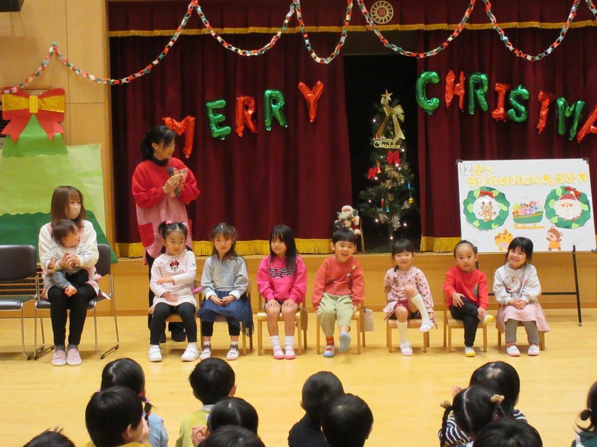12月生まれのお友だちはさくら組が2名とゆり組が3名(1人お休み)ともも組が3名と先生が3名です。みんなから「ハッピーバースデイ」の歌をうたってもらったり、先生手作りのバースデイカードをもらい、嬉しそうでした。第2部はクリスマス会を行い、ツリーをみんなで飾るとサンタさんが登場!!サンタさんからプレゼントをもらったので、お返しに踊りや歌のプレゼントをサンタさんにしました。楽しい時間を過ごしました。