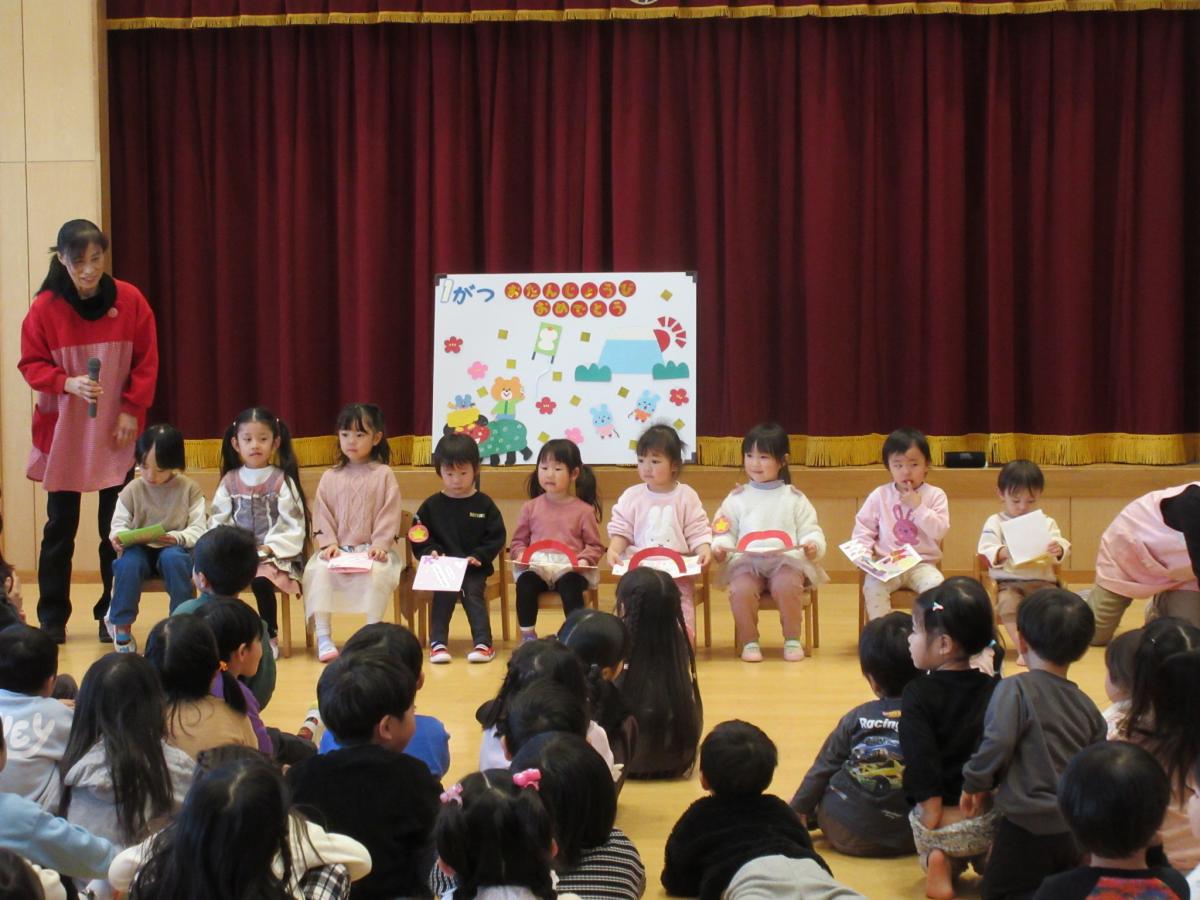 1月生まれのお友だちはさくら組が2名、もも組が4名、たんぽぽ組が1名、ひまわり組が1名、先生が1名です。12月の誕生会にお休みしたゆり組のお友だち1月の子と一緒にお祝いしてもらいました。みんなから「ハッピーバースデイ」を歌ってもらったり、先生手作りのバースデイカードをもらい、嬉しそうでした。第2部は「おせちを探せ」と「この先生だーれだっ!!」を楽しみました。