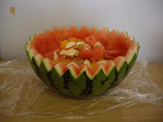 ナスの味噌汁、トリの空揚げ、フルーツ