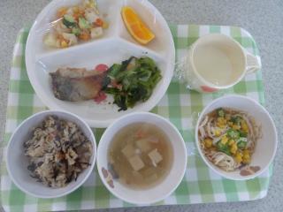 ポテトサラダ、サバの味噌焼き、フルーツ