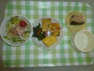ツナごはん、豆とひじきのサラダ、キャベツの味噌汁