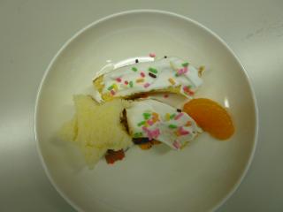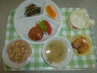 豆腐のふわふわ煮、ジャガイモの味噌汁、フルーツ