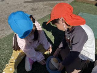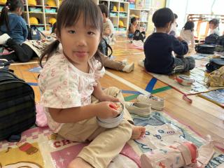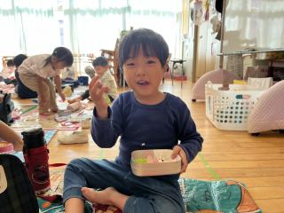 最初はレジャーシートを広げて、、、畳むこと、とっても難しく「出来ない~~~」と涙する子続出していましたが、今ではササっと広げ、折り目を見つけて畳みしまうことが出来るようになりました^^