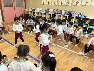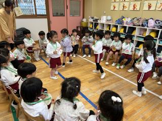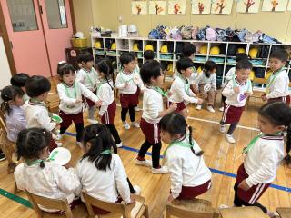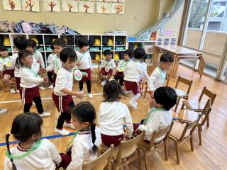 今日は楽しみにしていたガーデンパークへの園外保育に行けず残念でしたが、園でも楽しく過ごそう!ということでフルーツバスケットを行いました!前回は担任が用意していた果物のメダルを使って遊んだのですが、今回は自分たちでメダル作りからスタート!好きな果物を選んでクレパスで塗り絵をし、それをメダルに変身させてゲームをしました。