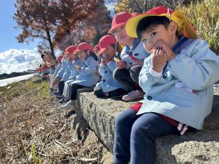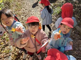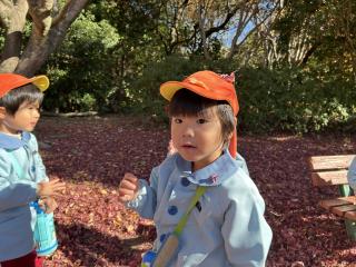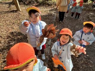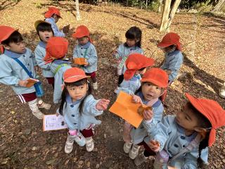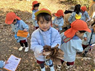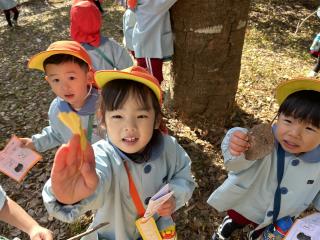 冬らしい寒さの中でしたが、「たくさんお散歩するよ!佐鳴湖だけじゃなくてもみじの葉っぱとかも見れるよ!」と伝えると「やった~!」と歩く気満々の子どもたち。秋探しのカードを手に、風の音やもみじの葉っぱ・穴の開いた葉っぱなど見つけると「あった~!」「風の音聞こえたよ~!」と口々に教えてくれました!