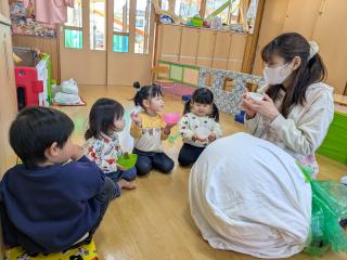 1コマダイアリー 一覧表示 2026年1月8日 おおきなかぶごっこ カブを育てているゆり組さん。今日は大きなカブごっこをして遊びました。「うんとこしょ、どっこいしょ」と一生懸命みんなで引っ張ると、、すっぽーん!と抜けました。みんなで飛び跳ねて「やったー!」と大喜びでした☆スープにして美味しく食べました♬ つづきを見る 2026年1月7日 1月7日の給食 ・ごはん・魚のみそ焼き(かじき)・さつまいもの甘煮・七草汁・おやつ ホットケーキ つづきを見る お知らせ 一覧表示 2025年12月12日 本日12日の「ちびっこあつまれ」ですが、園内にインフルエンザの感染があり、熱のお子さんが増えてきたので、中止にさせていただきます。皆様も気をつけてお過ごしください。 2025年11月20日 予防接種~ロタウイルスワクチンについて~ 2025年10月20日 予防接種について~インフルエンザワクチン~ 2025年7月10日 予防接種を受けていますか?~B型肝炎ワクチン~ 2025年6月3日 予防接種を受けていますか?~百日咳について~ 更新情報 一覧表示 更新情報はありません